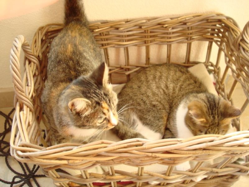 Een mandje in de kamer met dekentjes vinden ze ook heerlijk. En als Nel nu aan het haken is voor haar ”knus-en zus” kijken de katten niet eens meer naar het bolletje wol om.