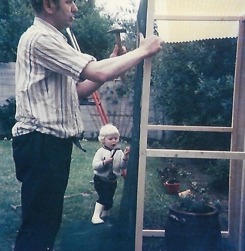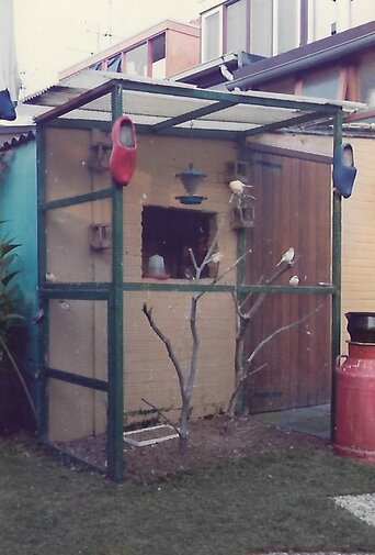 Mijn vader heeft vroeger zelf een volière gemaakt. Eerst heeft hij een gat gemaakt in de muur van de schuur voor het nachthok. Daarna is hij aan de slag gegaan met hout en gaas. Erwin heef hem hier nog mee geholpen. Zoals mijn vader zei: ‘Ik heb hem zelf bedacht, want ik had nog geen Freds bouwtekening.’