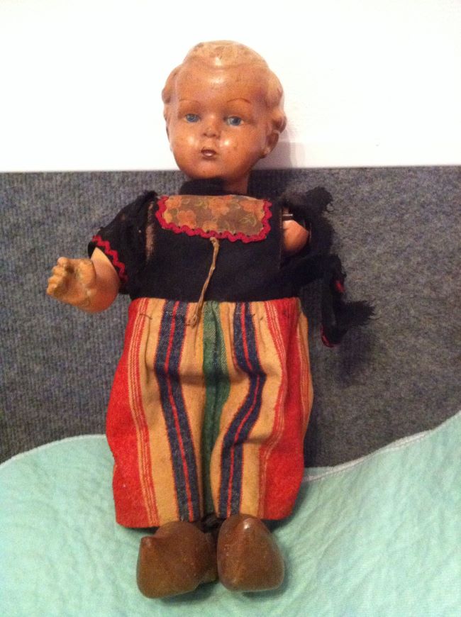 Leuke anekdote: Bij mijn opa en oma was onderstaande pop een verboden stuk speelgoed voor mijn vader en zijn broers en zus. De pop stond netjes tentoongesteld in de huiskamer, niemand mocht eraan komen. Later toen de kleinkinderen over de vloer kwamen is er volop gespeeld met de pop. Dat mocht toen ook van mijn opa en oma….alles voor de kleinkinderen (haha). Het ging er ook niet altijd zachtzinnig aan toe, zoals je wel kunt zien aan de afgebroken arm en de gescheurde kleding. Feit is wel dat de kleinkinderen het reuze naar hun zin hadden!!