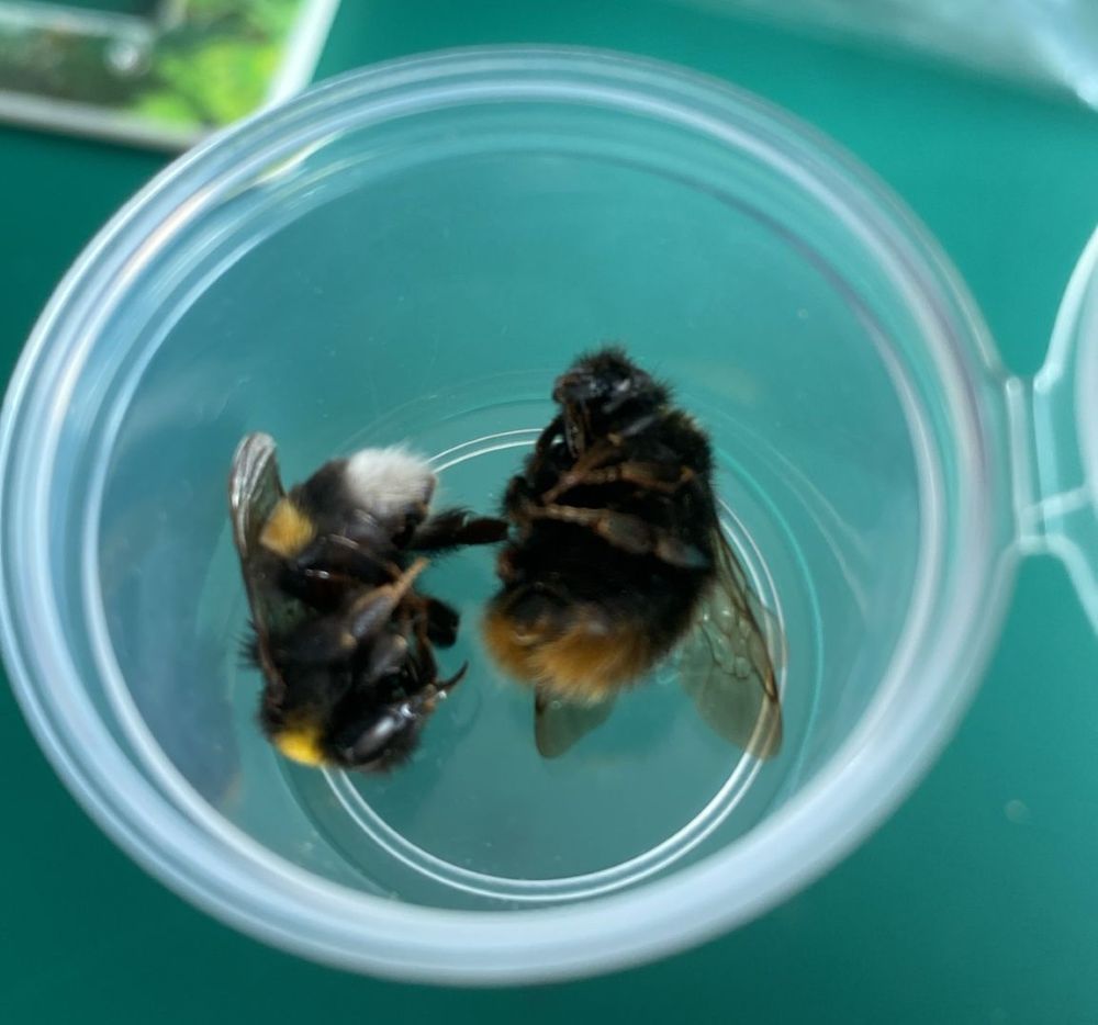 Op diezelfde woensdag kreeg ik van mijn zus het bericht dat ze, vlak achter elkaar, ook 2 hommels gevonden had. Op aanraden van mij heeft ze deze in een potje gedaan en meteen opgestuurd. Weer 2 voor het onderzoek!!