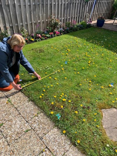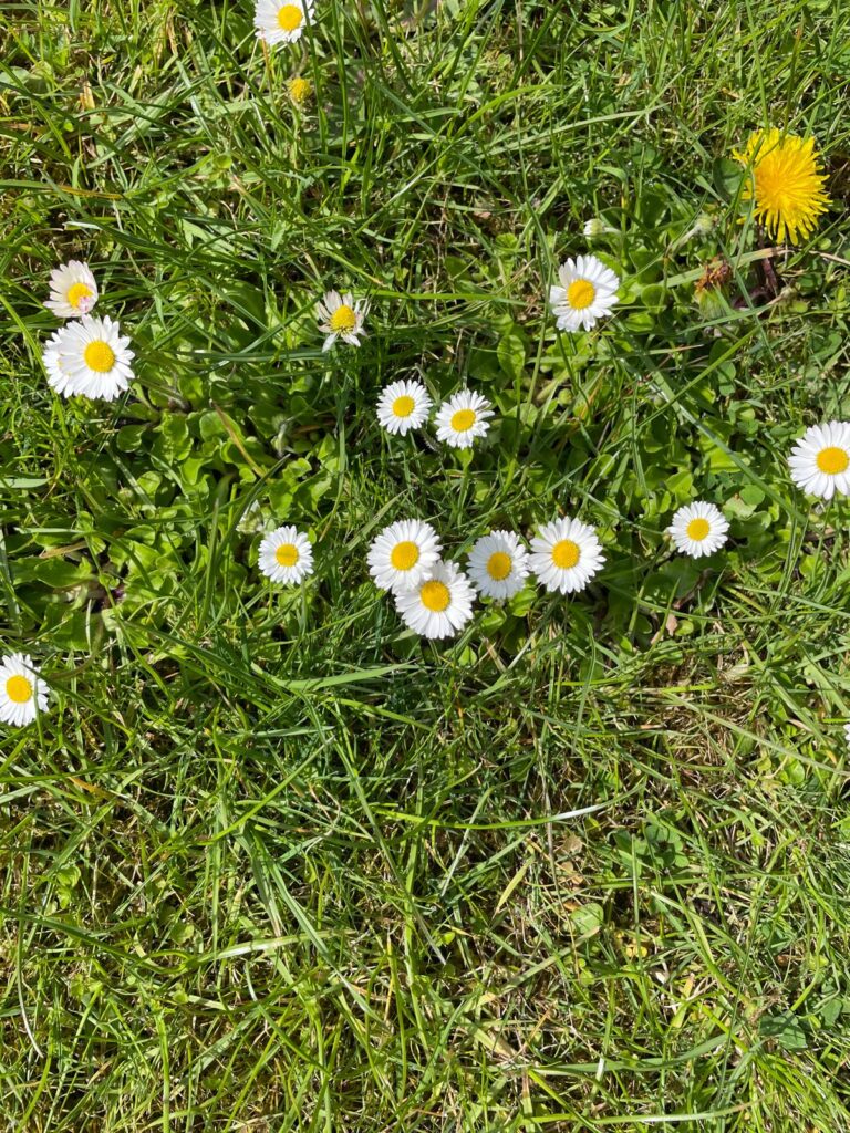 We hebben in één vierkante meter gazon 35 paardenbloemen geteld, 6 madeliefjes en 30 pinksterbloemen. Het totale deel in de tuin waar bloemetjes in het gras staan is 4.30m x 2.70m.