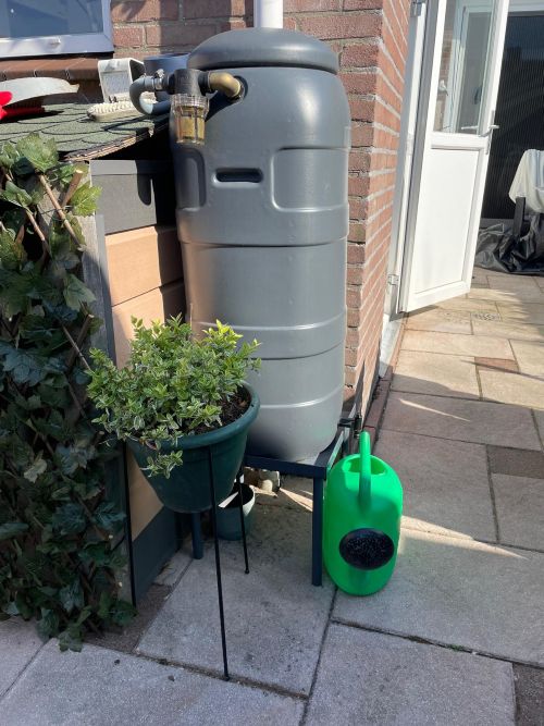 Misschien is er bij jullie in de buurt ook zo’n steengoeie actie waarbij je een regenton kunt winnen. We hebben nog een standaard en vulautomaat voor de regenton gekocht, en je ziet op de foto hieronder dat de ton zijn plekje in de tuin heeft gevonden.