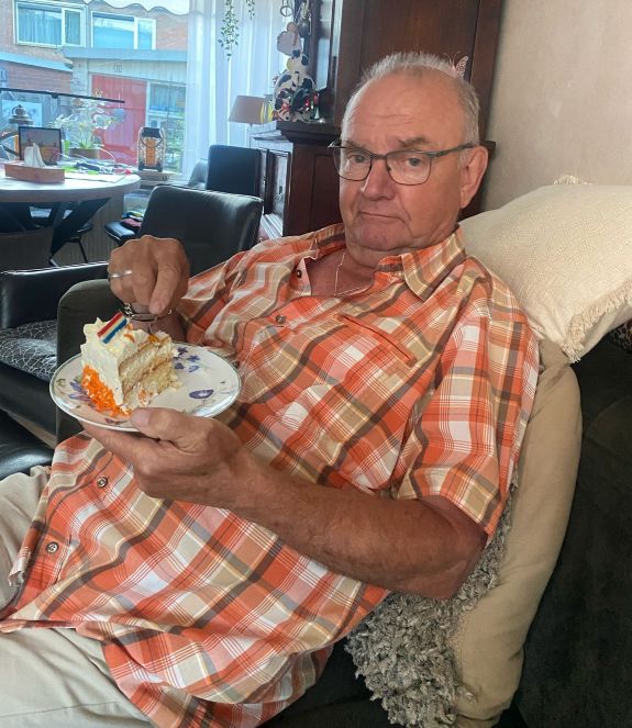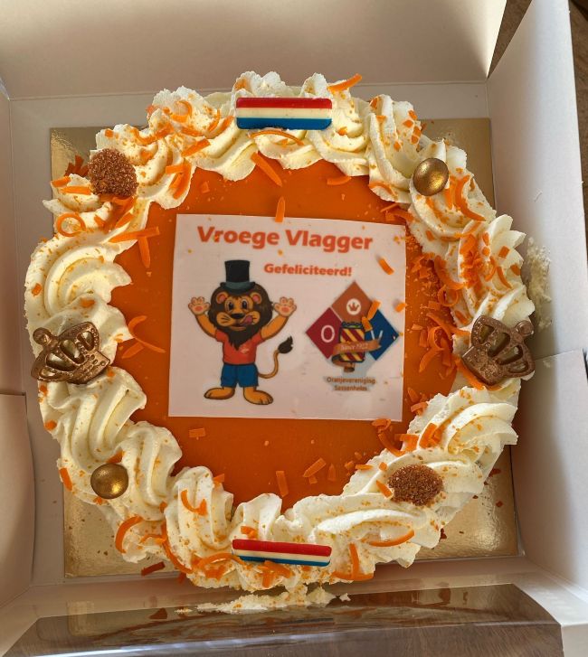 En misschien is er in jouw dorp of stad ook de mogelijkheid om een taart te winnen als jij vroeg de vlag buiten hangt op Koningsdag? Mijn zus en zwager hangen al jarenlang de vlag vroeg buiten op deze dag, maar helaas: nooit geen taart gewonnen. Maar de aanhouder wint! Afgelopen Koningsdag gingen zij weer een poging wagen, ze hadden de voortuin gezellig versierd met vlaggetjes en de vlag op tijd naar buiten gehangen. Om 7.30u ging de voordeurbel en mocht mijn zwager de taart in ontvangst nemen van iemand van de Oranjevereniging. Hoe leuk is dat!! Ik heb zelf ook een stukje van de lekkernij gehad en het smaakte prima!