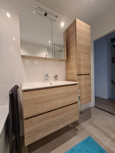 Tijdens de badkamer renovatie werden ook de badkamermeubels vervangen door nieuwe pronkstukken. Wij vinden het nog steeds een behoorlijke metamorfose en wij zijn dan ook super blij met het resultaat! Zowel de spiegelkast, de kolomkast en het wastafelmeubel zijn van het merk Tiger (type Loft).