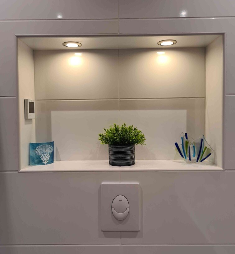 Onze nieuwe badkamer hebben we voorzien van een nis. Deze heb ik gemaakt boven het toilet en natuurlijk wilden we hier verlichting in hebben. Dit is de derde sectie van ons lichtplan en het wordt net als de andere twee secties afzonderlijk geschakeld. Het heeft even geduurd voordat we de juiste spotjes hadden gevonden en ook het installeren van het geheel had wat voeten in de aarde… Maar ook dit project is uiteindelijk weer opgelost!