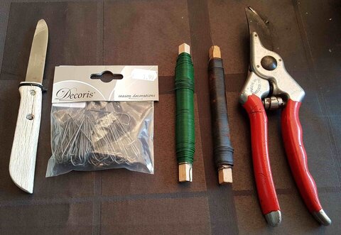 • Een bakje en een bord. Het bord wordt gebruikt als basisondergrond voor het kerststuk en het bakje is een handig hulpmiddel voor het groenafval.